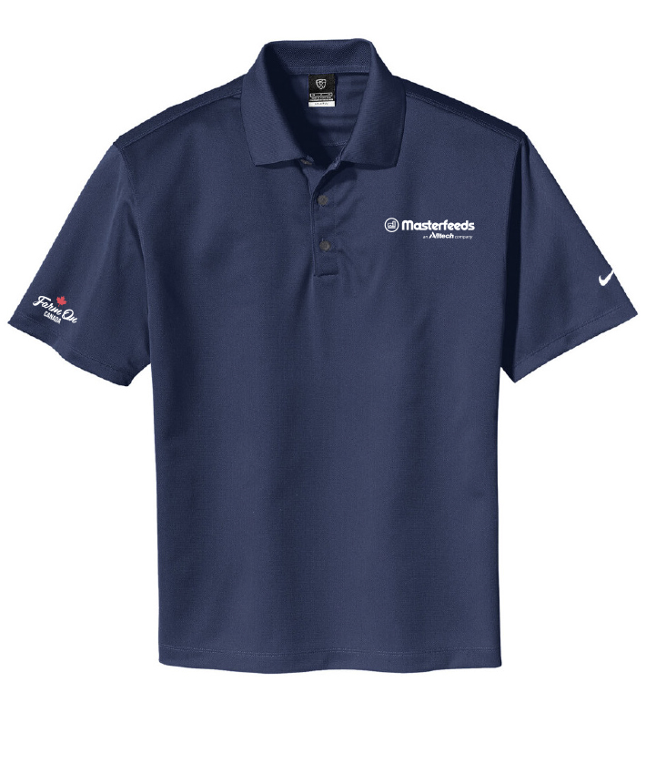 Nike Tech Basic Dri-Fit Polo. Masterfeeds Embroidered on Left Chest and Farm On Logo on Right Sleeve.