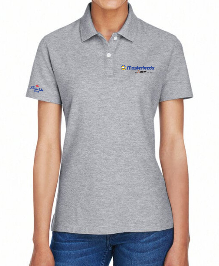 Ladies Devon & Jones Grey Heather Polo w Masterfeeds Logo Embroidered on Left Chest and Farm On Logo on Right Sleeve.